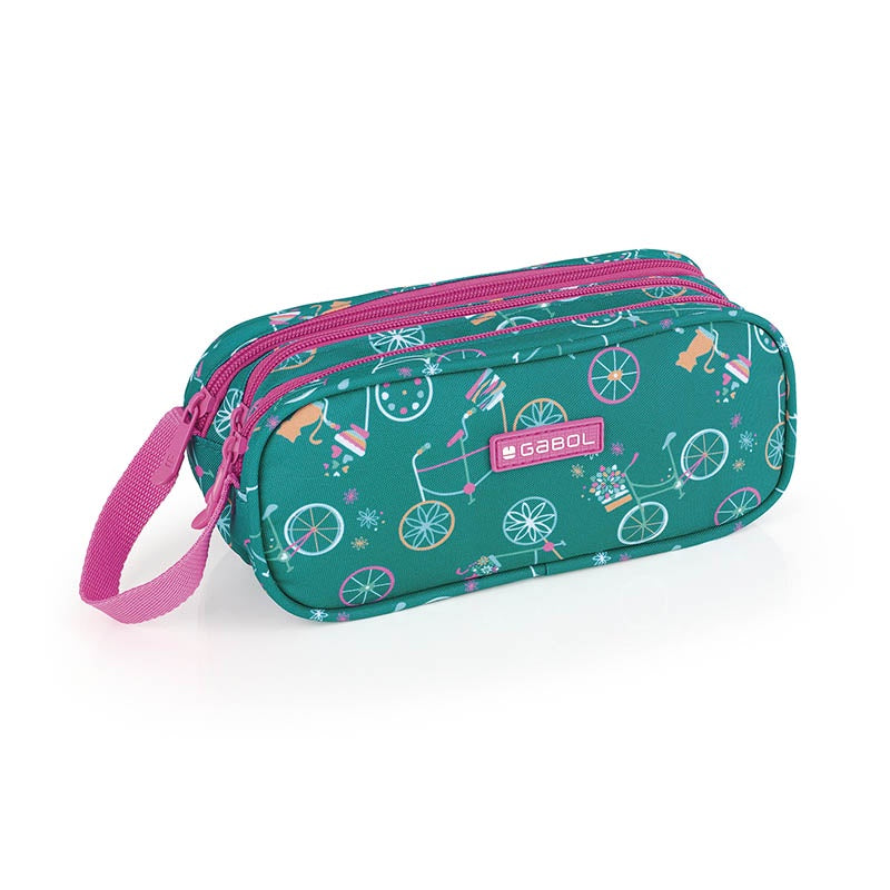 Estuche triple con asa. Fabricado con material libre de PVC. Material impermeable. Medidas: 22cm x 9cm x 9cm