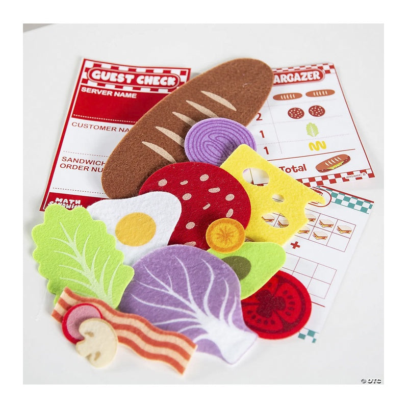 Math Sandwich le permite a su hijo abrir su propia tienda de sándwiches y explorar varios conceptos matemáticos. Mientras construye sándwiches a partir de piezas de comida de fieltro duraderas, su hijo desarrollará habilidades esenciales de conteo y reconocimiento de números.