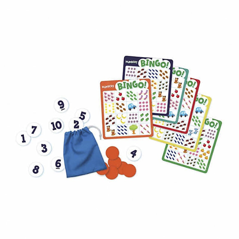Une las fichas numéricas con los espacios que muestran el número correspondiente de mariquitas, plátanos y otros elementos coloridos en los cartones de bingo.