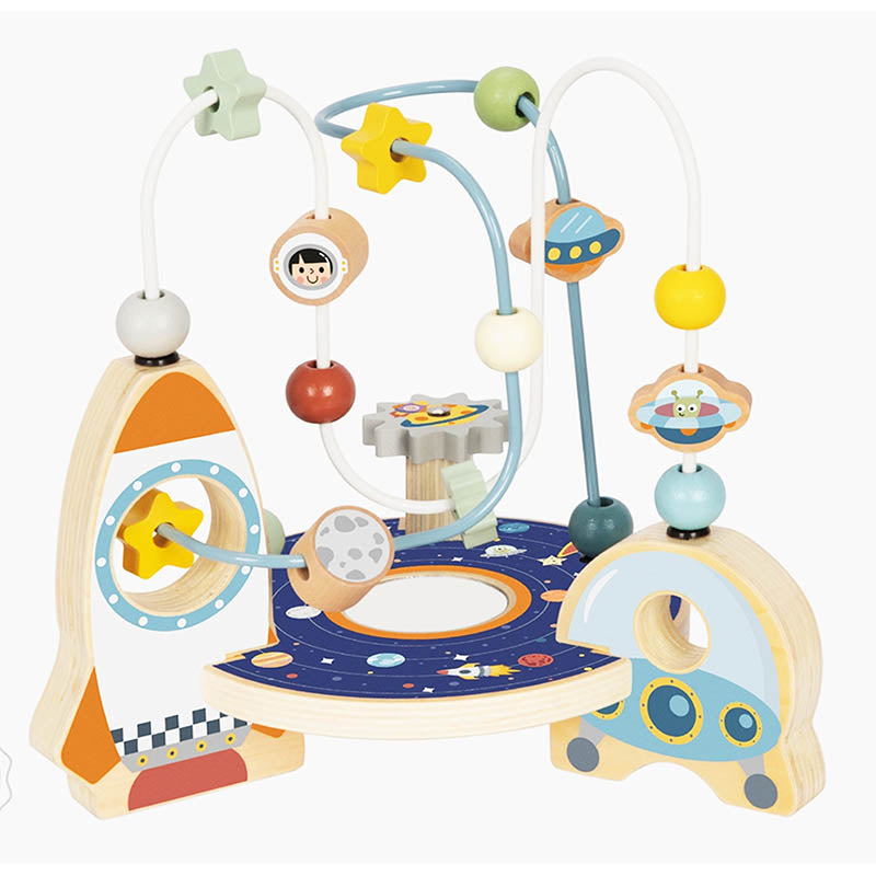 Este juguete de madera presenta un diseño atractivo con planetas, cohetes y cuentas de colores que se deslizan a través de divertidos caminos metálicos. Mientras juegan, los niños desarrollan la coordinación mano-ojo, la destreza y el reconocimiento de colores y formas, todo dentro de un entorno seguro y educativo.